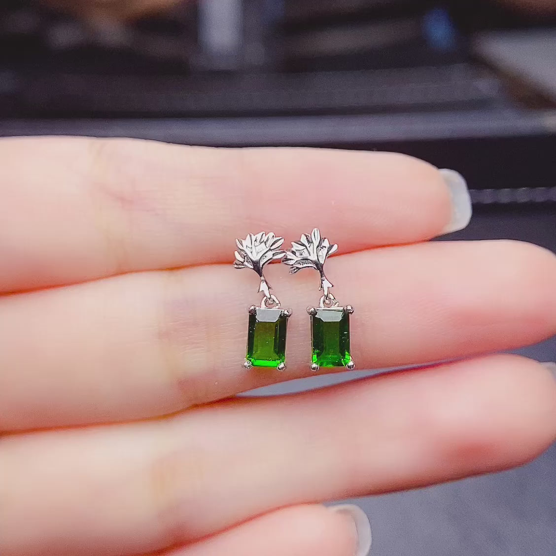 Natural diopside earrings have arrived, with excellent color and crystal clarity, sparkling with fiery colors. S925 silver precision inlay is stunning, with a main stone size of 4 * 6mm.