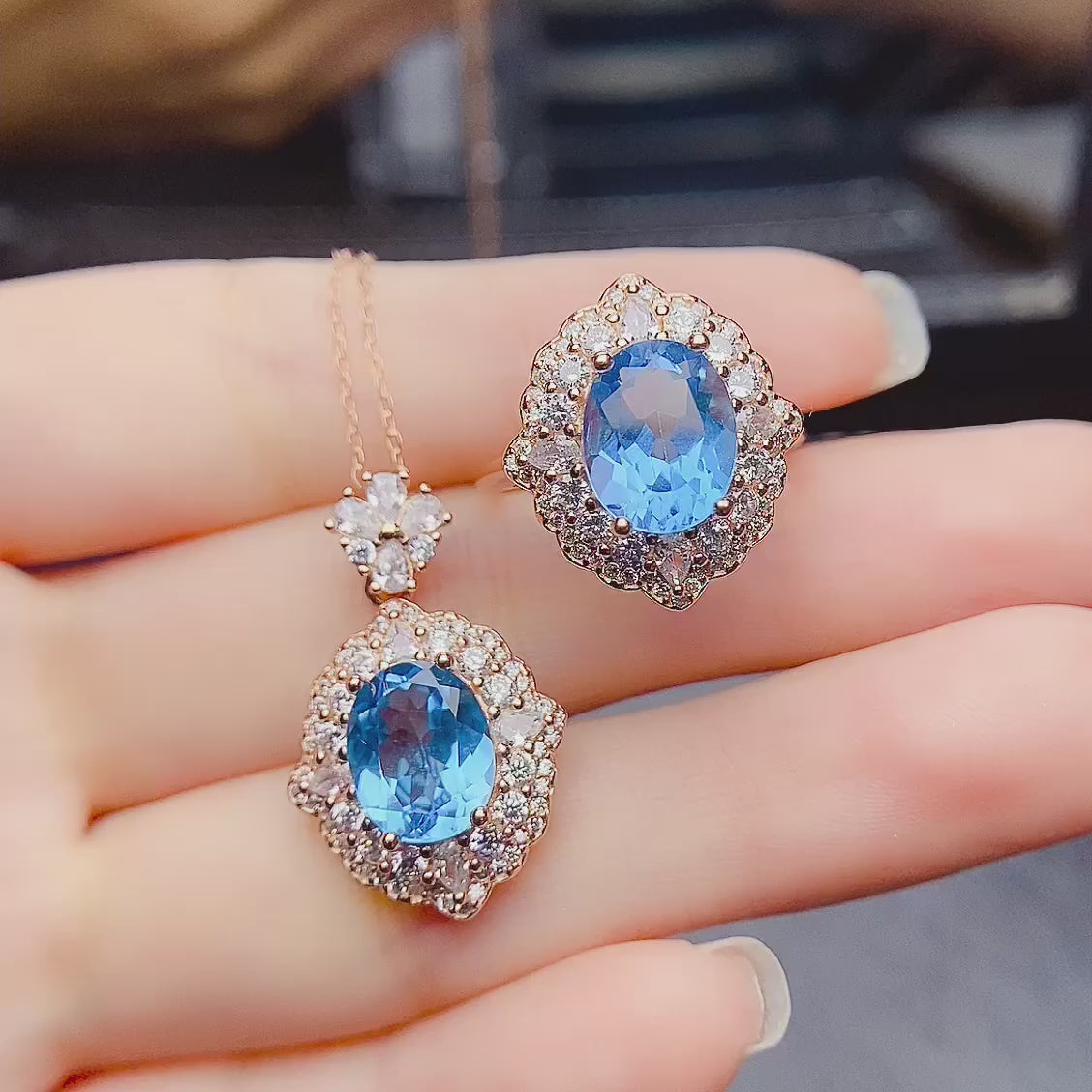 The natural topaz set has arrived, with excellent color and crystal clear and sparkling colors. S925 silver precision inlay is stunning, with a main stone size of 8 * 10mm.